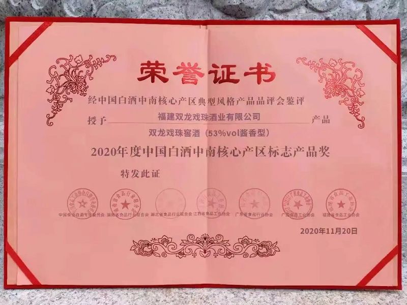 在20日舉行的中南核心產(chǎn)區典型風(fēng)格產(chǎn)品品評會(huì )上,經(jīng)30位白酒專(zhuān)家對中南六省80余款代表性產(chǎn)品進(jìn)行現場(chǎng)暗評。雙龍戲珠酒業(yè)選送的雙龍戲珠窖酒(53%vol醬香型)榮獲“2020年度中國白酒中南核心產(chǎn)區標志產(chǎn)品獎”。