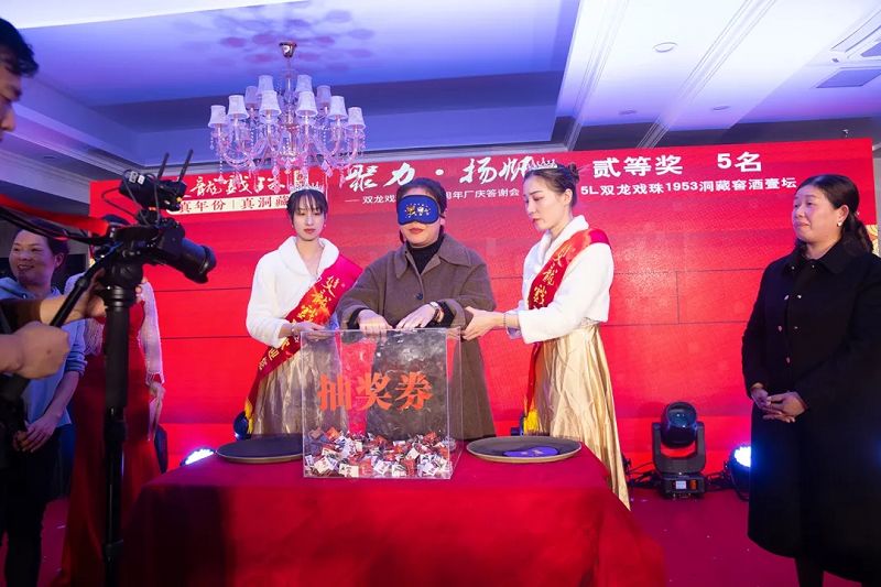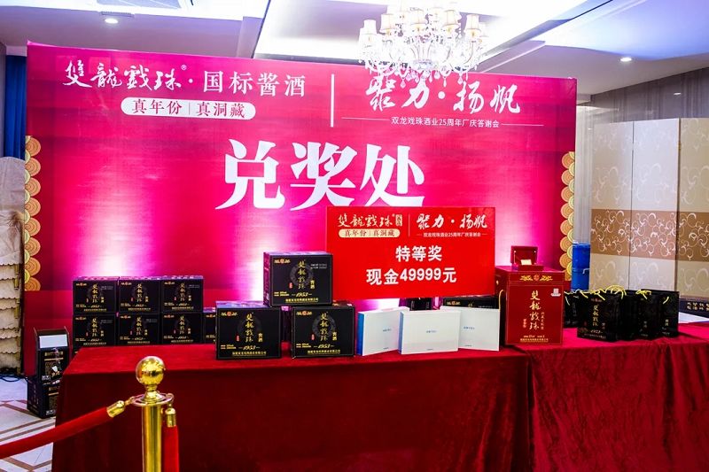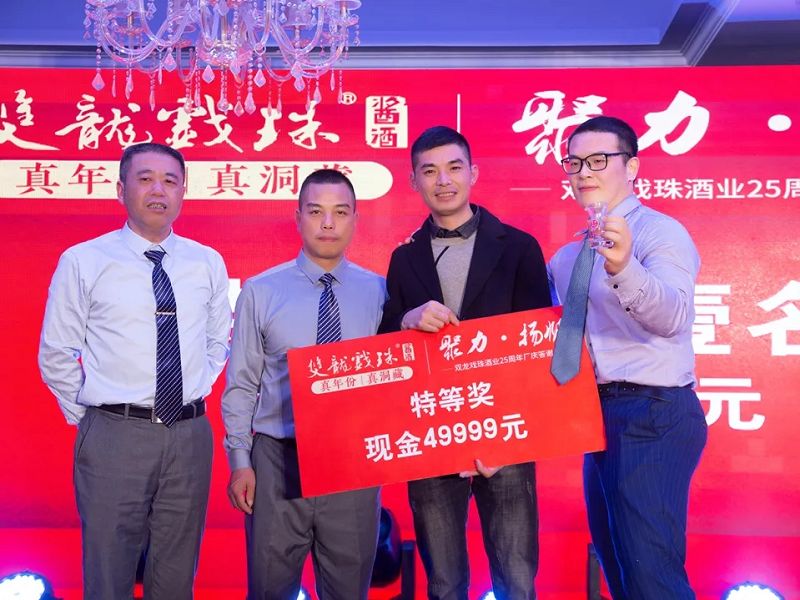 精彩的活動(dòng)少不了重磅的大獎,本次雙龍戲珠酒業(yè)25周年廠(chǎng)慶答謝宴(政和站)設置了特等獎(49999元現金大獎)、一等獎(10克雙龍戲珠金條)、二等獎(5L雙龍戲珠1953洞藏窖酒)、三等獎(華為平板壹臺)、四等獎(雙龍戲珠1953窖酒248ml壹箱)、幸運獎(雙龍戲珠1953窖酒248ml貳瓶)。