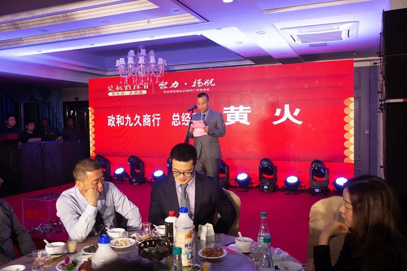 九久貿易商行總經(jīng)理黃火代表各位合作商和廣大消費者對雙龍戲珠酒業(yè)25周年廠(chǎng)慶表示祝賀。