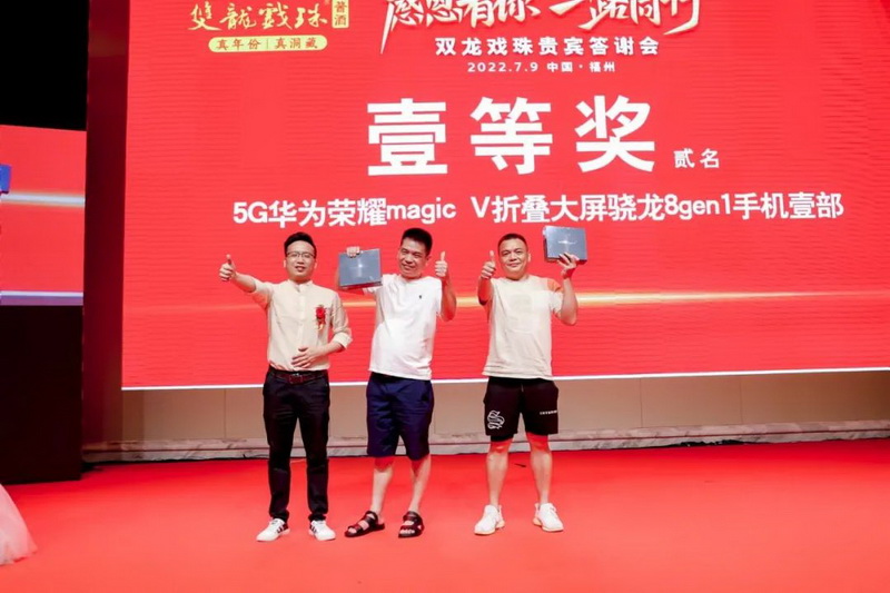 在每輪節目過(guò)后,現場(chǎng)都抽取了幸運觀(guān)眾并送出重磅大獎,榮耀折疊屏手機、10克雙龍戲珠金條、華為手表、2.5L1985醬酒壇酒,更有49999元現金大獎!五輪的抽獎環(huán)節將現場(chǎng)氣氛推向了最高潮。
